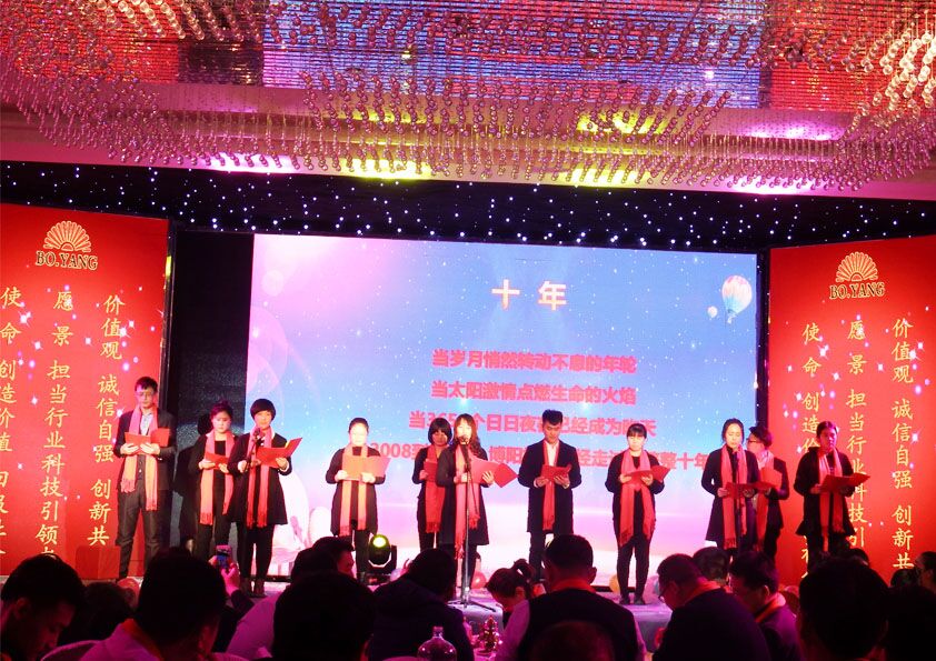 歡樂在繼續(xù),熱情在高漲!安丘博陽機(jī)械數(shù)據(jù)中心的詩(shī)朗誦《十年精彩,共筑輝煌》,引爆了大會(huì)的高潮。詩(shī)歌分為四大部分:十年、歷程、感恩、展望!從2008年6月19日到現(xiàn)在,安丘博陽機(jī)械已經(jīng)走過了十個(gè)年頭。十年奮斗和進(jìn)取、十年功勛和業(yè)績(jī);十年磨礪十年拼搏,鑄就了我們安丘博陽機(jī)械鋼鐵般的品牌信譽(yù),和我們博陽人堅(jiān)韌和抱負(fù)!回首,來時(shí)的路是泥濘的,但是只有泥濘的道路才能留下腳?。粊頃r(shí)的路是坎坷的,但是只有遇到困難才能有下一步的成長(zhǎng)!