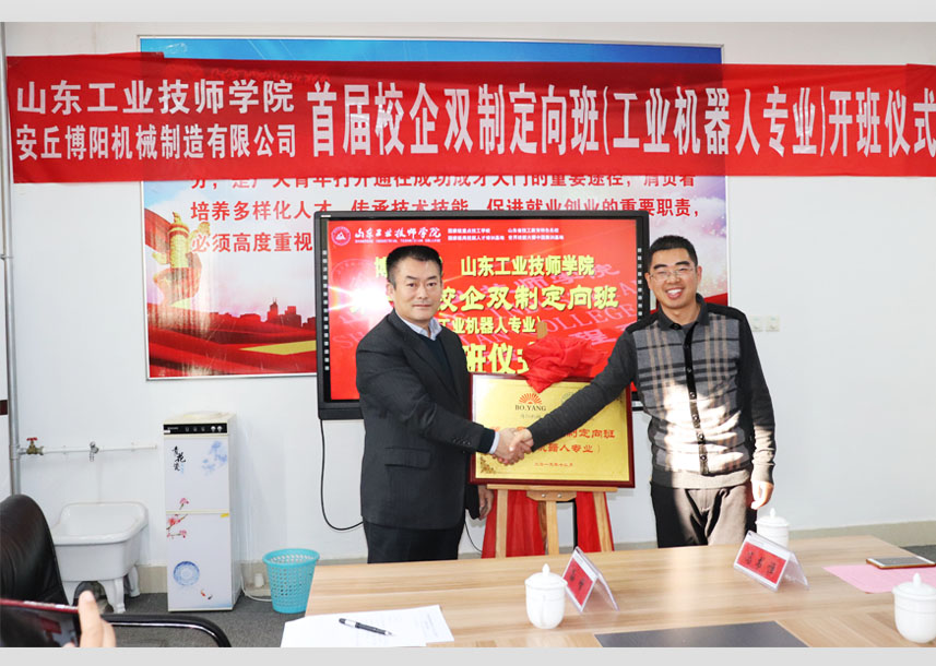 2019年12月24日上午10點(diǎn),首屆“博陽(yáng)校企雙制定向班(工業(yè)機(jī)器人專業(yè))”開班儀式在山東工業(yè)技師學(xué)院舉行,山東工業(yè)技師學(xué)院教務(wù)處李新功處長(zhǎng)參加并致辭,現(xiàn)代制造工程系周明鋒主任與閆吉祥總經(jīng)理進(jìn)行揭牌,并為孫紅金副總經(jīng)理頒發(fā)“博陽(yáng)校企雙制定向班”班主任聘書,閆吉祥總經(jīng)理為周明鋒主任頒發(fā)博陽(yáng)機(jī)械“技術(shù)顧問(wèn)”聘書,齊魯理工大學(xué)王佐勛教授及公司郭偉總經(jīng)理、李文明副總經(jīng)理一同參加活動(dòng)。